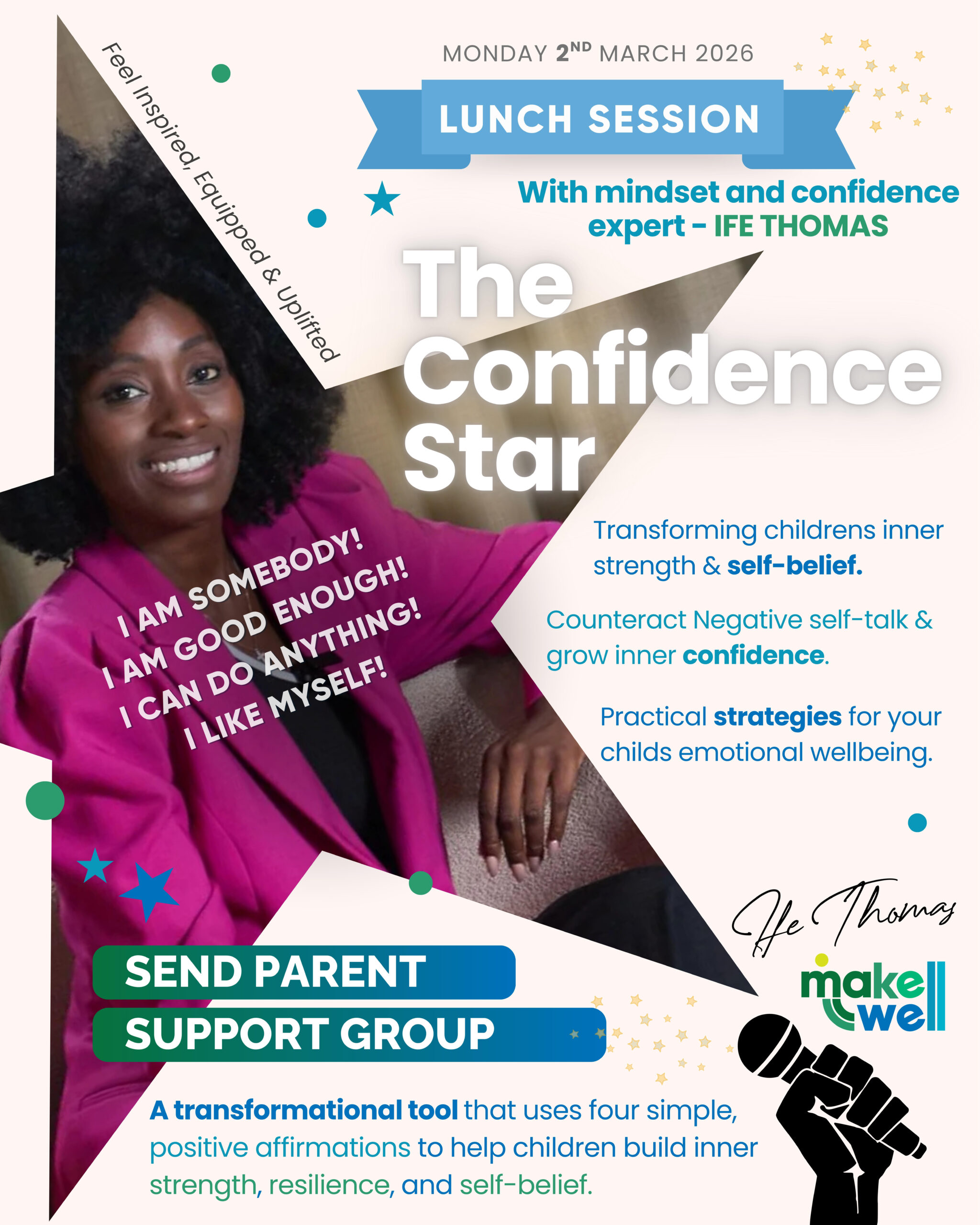 Join us for a powerful lunchtime session designed especially for SEND parents, where we’ll explore The Confidence Star – a transformational tool that uses four simple, positive affirmations to help children build inner strength, resilience, and self-belief. Created by mindset and confidence expert Ife Thomas, The Confidence Star gently equips young people to counteract negative self-talk and grow confidence from the inside out, giving you practical strategies to support your child’s emotional wellbeing every day.